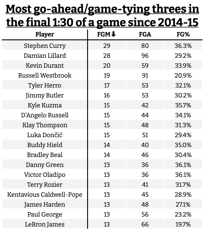 Trong 11 năm qua, 1 phút rưỡi cuối cùng hòa & và vượt qua danh sách 3 điểm: Curry thực hiện 29 cú sút nhiều nhất và có tỷ lệ sút cao nhất.